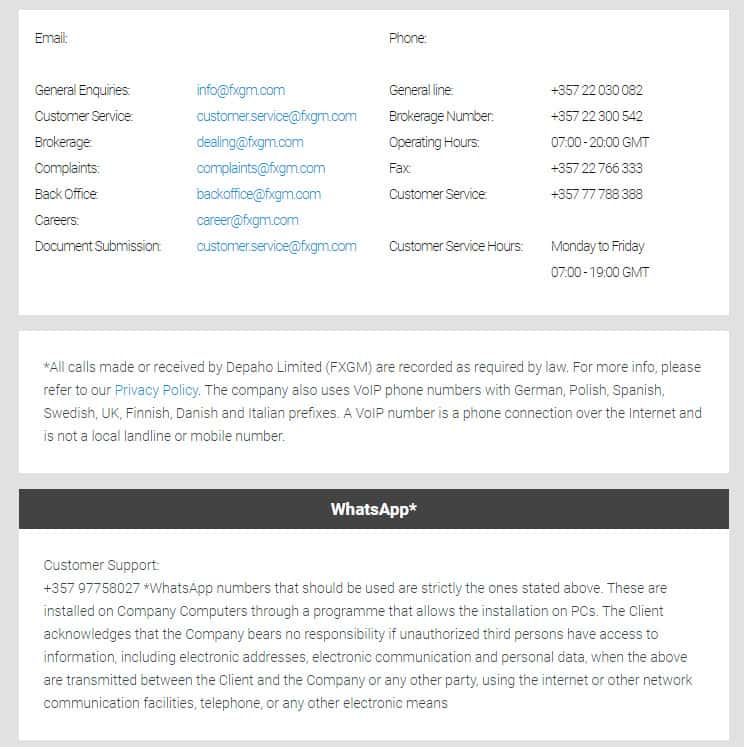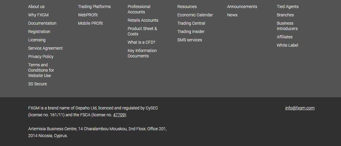 Под свои довольно сомнительные контакты аферисты FXGM не отводили отдельный раздел своего сайта, вместо этого жулики ФХГМ разместили свои контакты в конце подвального сайта. Контактов у шулеров FXGM довольно мало, что говорит об их не особом желании иметь дело с наивной клиентурой.