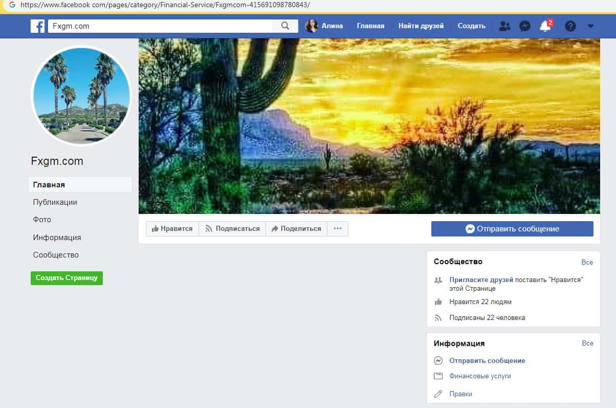 Для размещения различных заманчивых постов с лапшой на уши наивной клиентуре аферисты FXGM обзавелись страницей в социальной сети Facebook, где у мошенников FXGM имеется всего 9 подписчиков. На изображении, расположенном ниже, вы можете увидеть страницу аферистов FXGM на площадке Facebook.