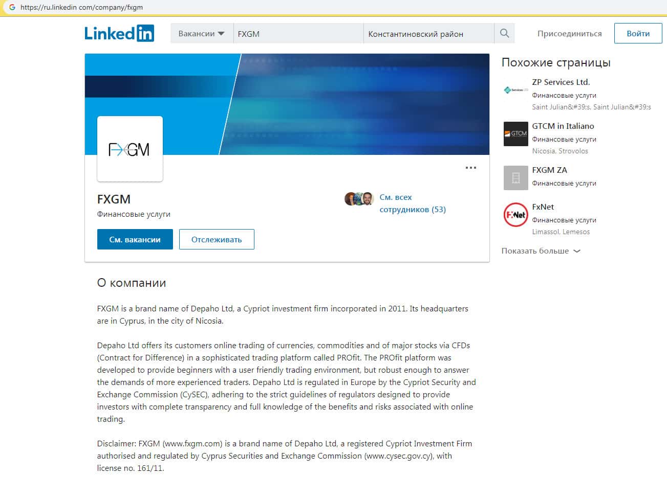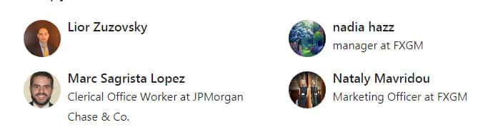 Кроме того, аферистов FXGM есть и страница в социальной сети Llinkedin, где у шулеров FXGM размещена довольно стандартная и типичная лапша на уши. На изображении, расположенном ниже, вы можете наглядно увидеть страницу аферистов FXGM в социальной сети Linkedin и некоторых работников организации.