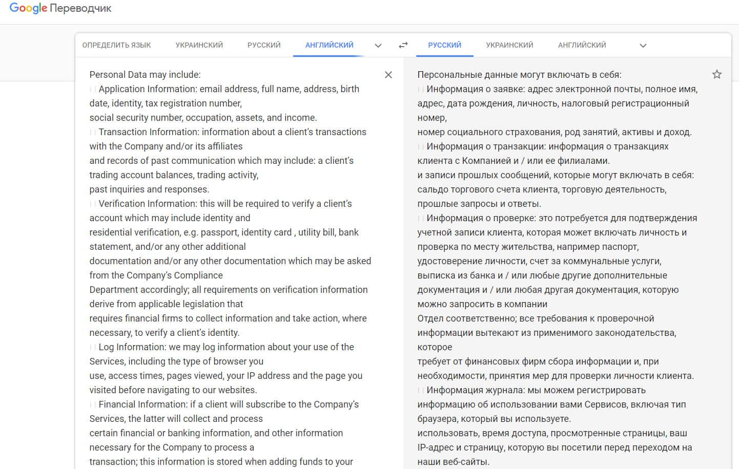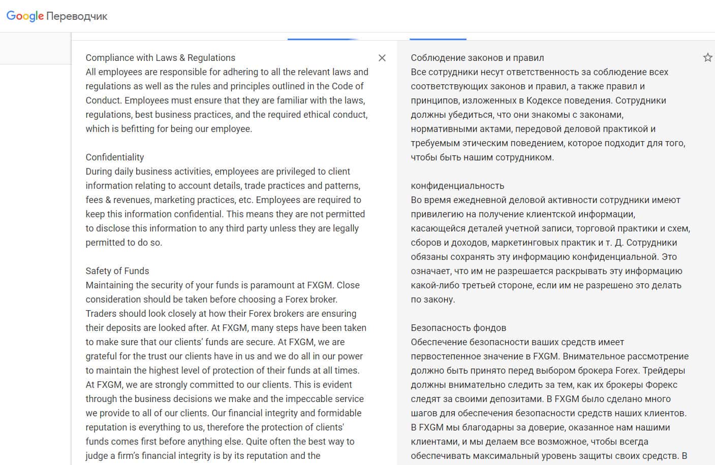 Для удобства ниже приведен скриншот переводчика некоторых фраз, которые говорят сами за себя о жульничестве конторы ФХГМ и нежелании нести какую-либо ответственность за информацию о пользователях и тем более их состояние счета на подвальном сайте FXGM