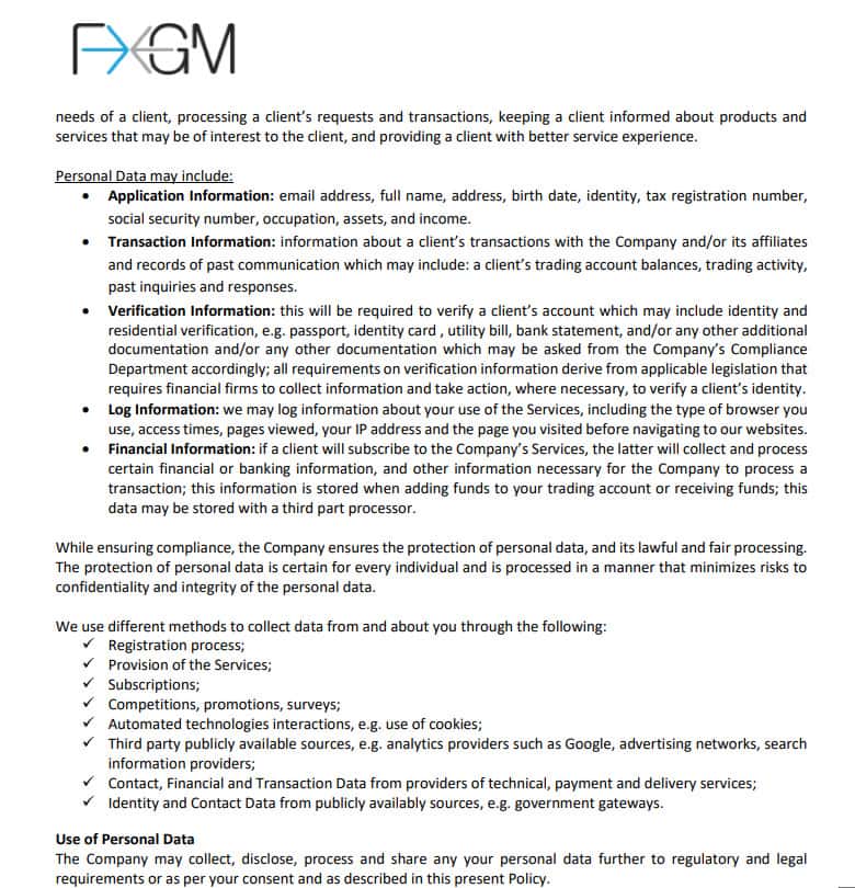Следующий раздел политики конфиденциальности у аферистов FXGM продолжается почти также, без смысла и наполнено водой. Если вы работаете с ФХГМ, то подвергаете опасности себя на получения левого кредита, о котором узнаете самыми последними. Ниже вы можете увидеть документ политики аферистов.