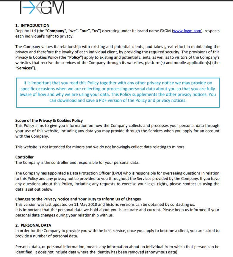 Политика конфиденциальности у аферистов FXGM начинается вполне стандартно и ожидаемо, а именно с "воды" о том, что это за документ и зачем он нужен. Данная информация не несет в себе никакой смысловой нагрузки и расположена шулерами ФХГМ исключительно для вида. Ниже вы можете увидеть документ политики аферистов.