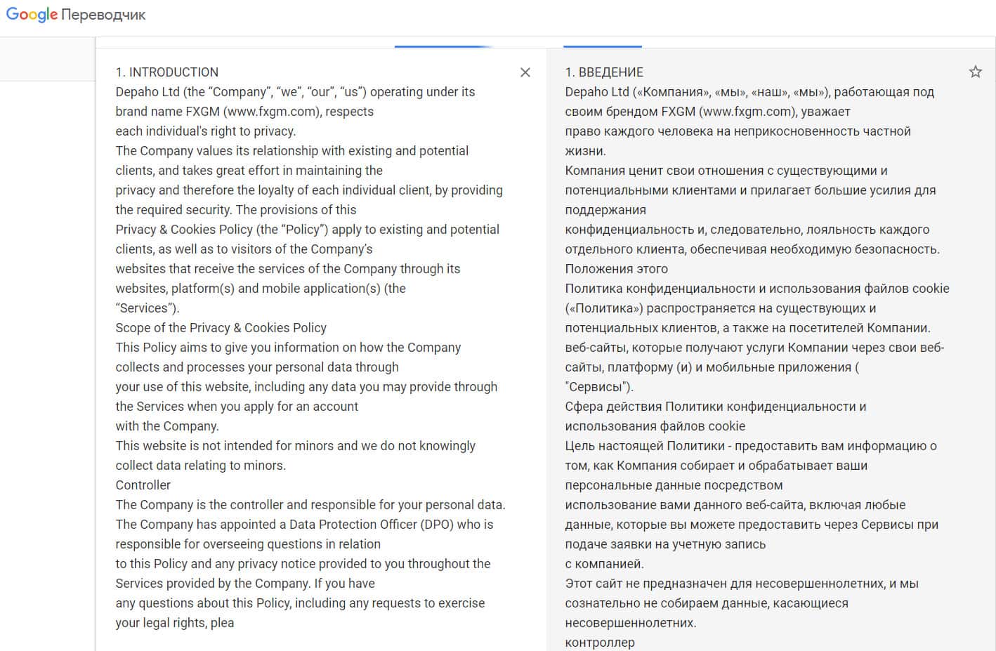 Далее, на изображении ниже, вы можете увидеть перевод на русский язык первого раздела из документа клиентского соглашения мошенников ФХГМ путем использования Гугл Переводчика. Жулики FXGM умело прячут среди воды фразочки, на которые простой обыватель не станет обращать внимания и пристально вчитываться в документ.