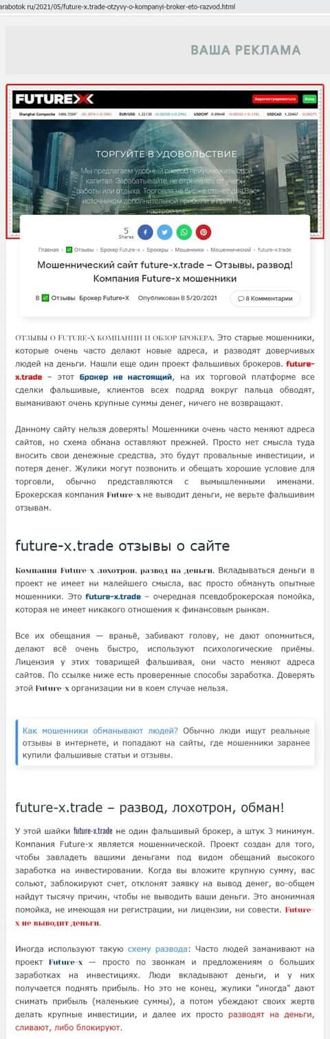 Полна разоблачений мошенничества на брокерской площадке Фьючер Икс и статья, опубликованная на портале rabota-zarabotok ru, содержащая ряд предупреждений пользователям сети.