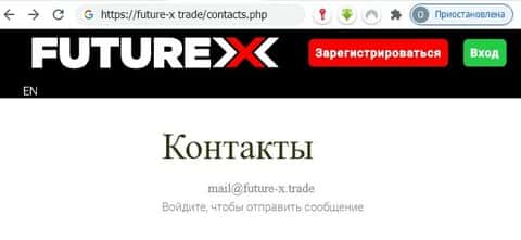 Портал брокерской шараги Фьючер Икс предлагает лишь адрес электронной почты для связи с администрацией проекта, ни телефонов, ни онлайн-чата, ничего нет: