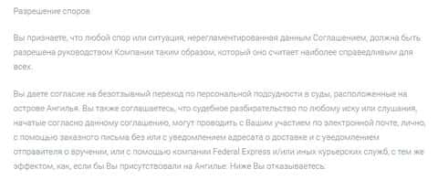 Учитывая заявления мошенников о их расположении в Эстонии, становится удивительным и невразумительным их заявление о рассмотрении споров в судах острова Ангилья.