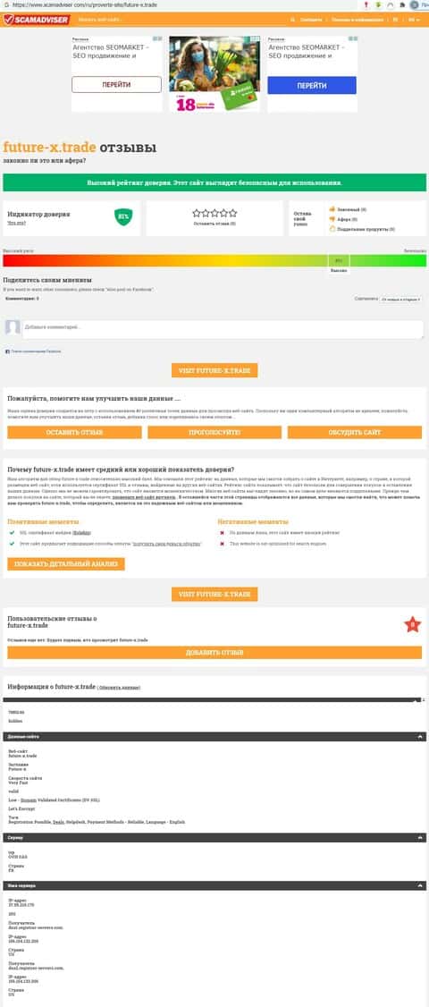 - На что указывает портал scamadviser при рассмотрении сайта брокерской конторы Фьючер Икс?