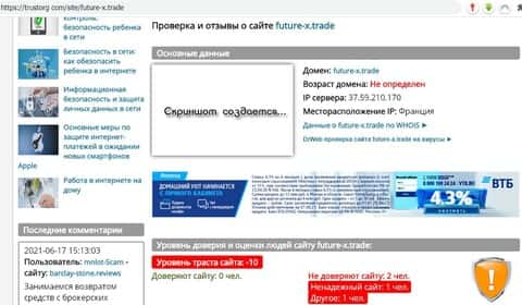 - Выводы портала "Доверие в сети" на основе анализа характеристик сайта аферистов из Фьючер Икс