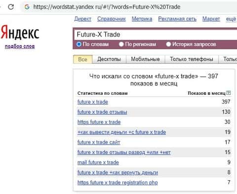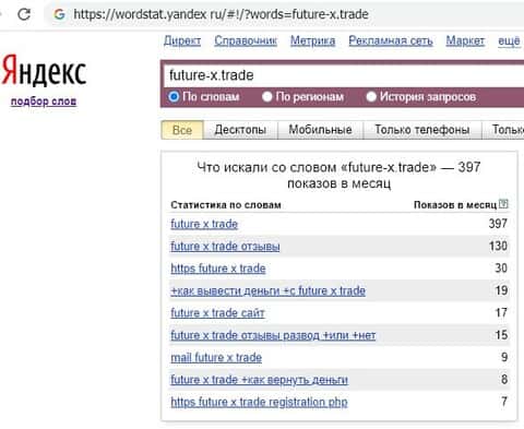 Показатели поисковых запросов сайта брокерской шараги future-x trade держаться на том же уровне, что и показатели английского названия бренда.