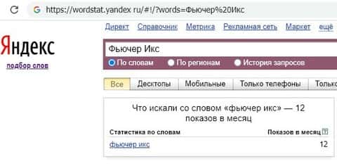 Количество поисковых запросов бренда "Фьючер Икс" в системе яндекса невелико, всего двенадцать в месяц, что говорит о практически низкой популярности данного ресурса.
