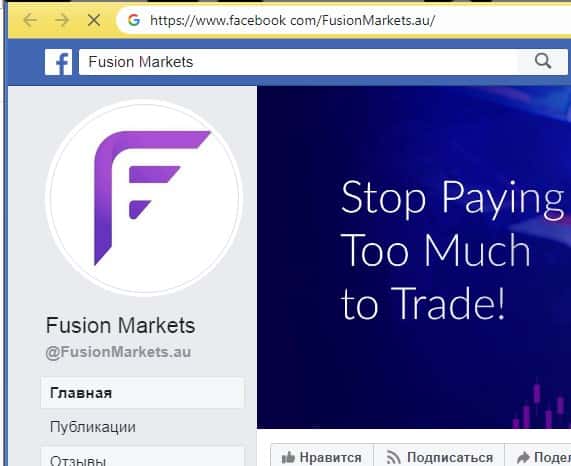 Чтобы постить различные заманчивые посты с лапшой на уши наивной клиентуре аферисты Fusion Markets обзавелись страницей в социальной сети Фейсбук, где у мошенников Фьюжин Маркетс имеется несколько тысяч подписчиков. На изображении, расположенном ниже, вы можете увидеть страницу аферистов Фьюжин Маркетс на площадке Facebook.