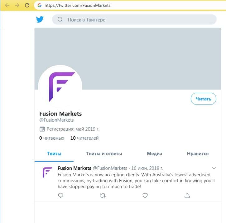 Кроме того, аферистов Fusion Markets есть и страница в социальной сети Твиттер, где у шулеров Fusion Markets размещена довольно стандартная и типичная лапша на уши и накручено пару подписчиков. На изображении, расположенном ниже, вы можете наглядно увидеть страницу аферистов Fusion Markets в социальной сети Twitter.