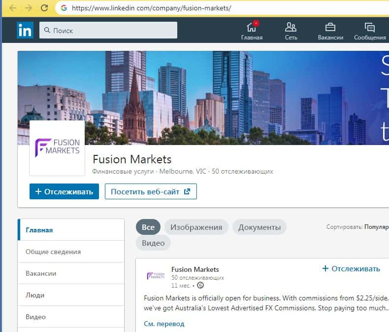 Ну и конечно, чтобы соответствовать современным трендам шулера Фьюжин Маркетс создали себе страницы в социальных сетях, одной из которых является ЛинкедИН, где у мошенников Fusion Markets имеется немного подписчиков. На изображении, расположенном ниже, вы можете увидеть внешний вид страницы проходимцев в этой социальной сети.