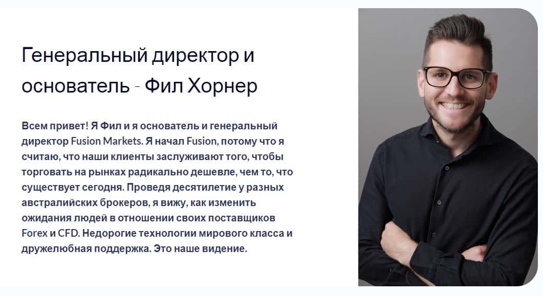 Основатель шарашкиной конторы Fusion Markets - Фил Харнер не стесняется показывать свои наглые глаза на всю страницу сайта, при этом внушает клиентам о том, что делает торговлю дешевле для своих клиентов, а также внедряет передовые технологии. Слишком это красиво, явно попахивает мошенничеством.