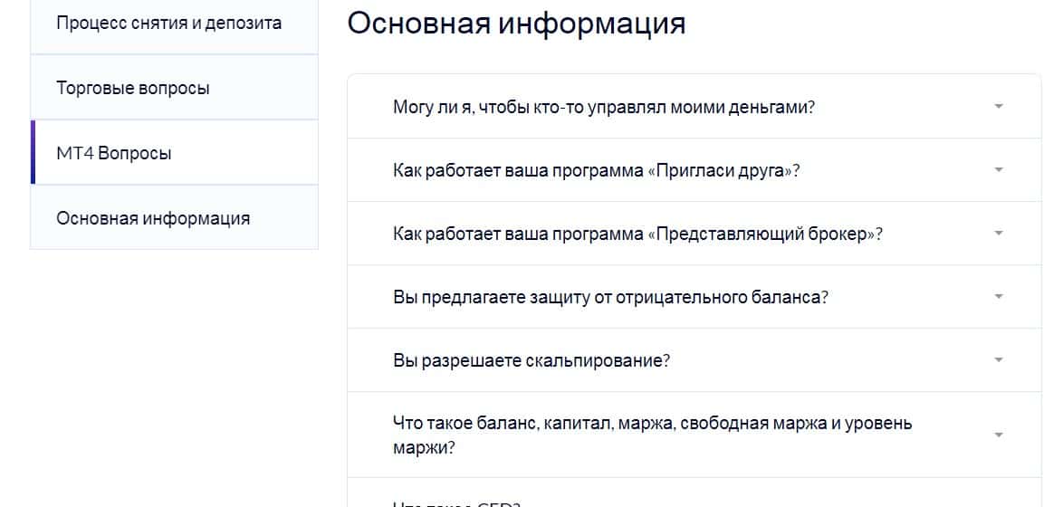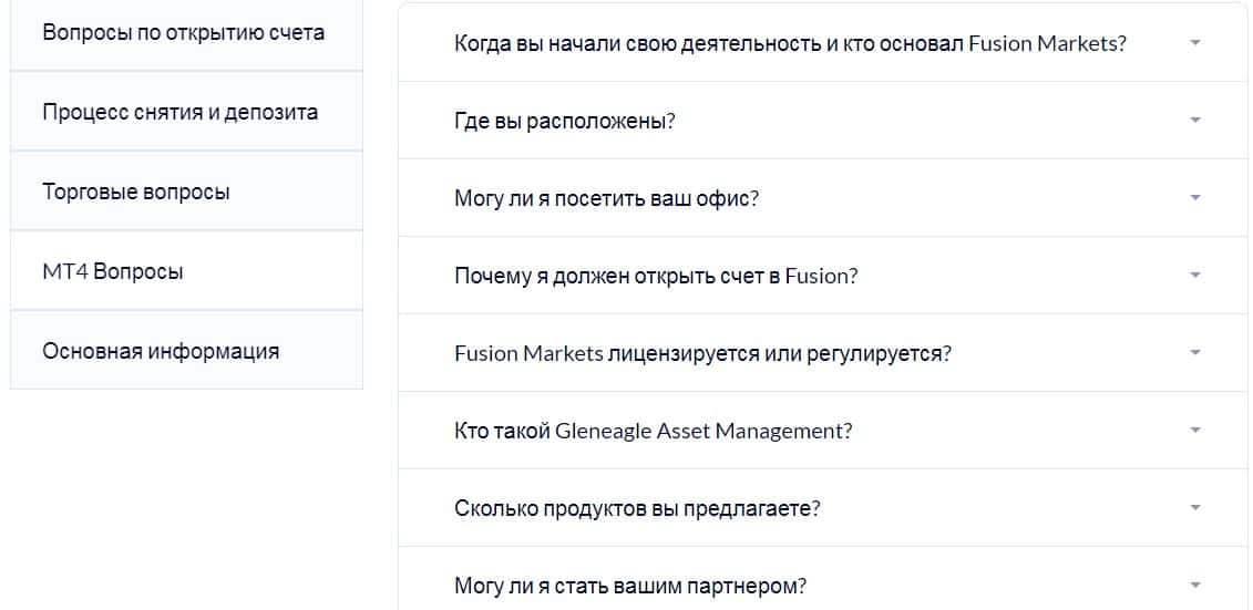 Ниже представлен скриншот с основными вопросами, которые рассматриваются в разделе сайта. Все типичные и ожидаемые, никаких секретов или подводных камней, аферисты Fusion Markets, конечно, выдавать не собираются. Их задача - слить побольше счетов, а для этого надо хорошенько втереться в доверие.