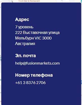 Обманщики с компании Фьюжин Маркетс утверждают, что готовы круглосуточно помогать своим клиентам, о открытости и честности к своим клиентам, что является самой большой ложью. На сайте лохотрона Fusion Markets нет реальных данных компании, ни реального телефона по которому можно с ними связаться. Контакты, которые они предоставили: