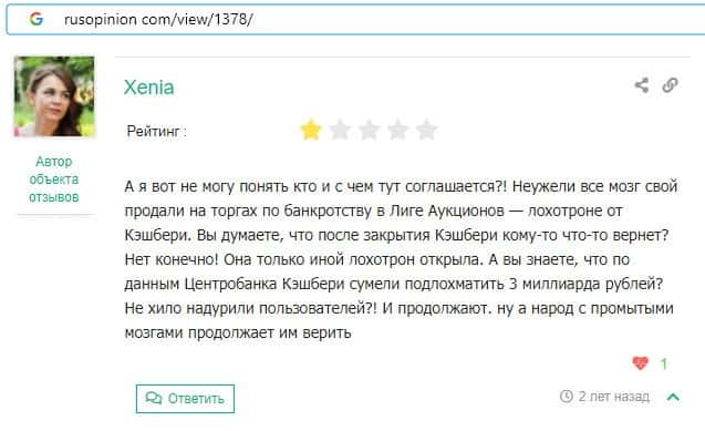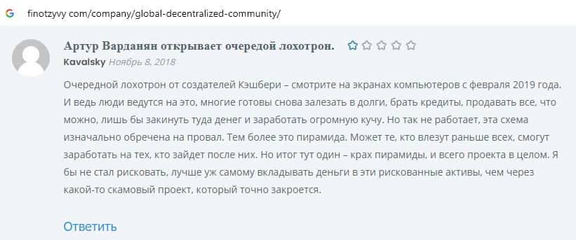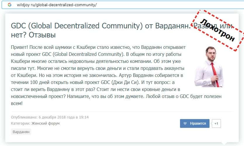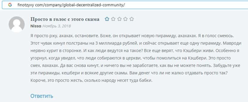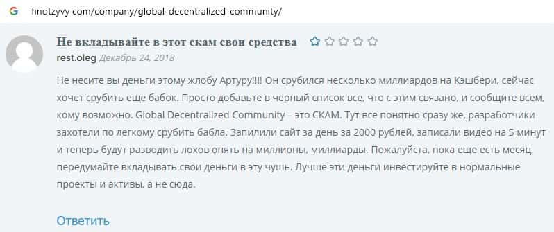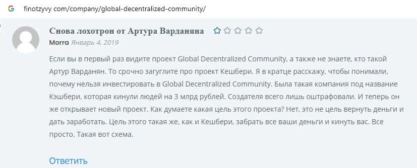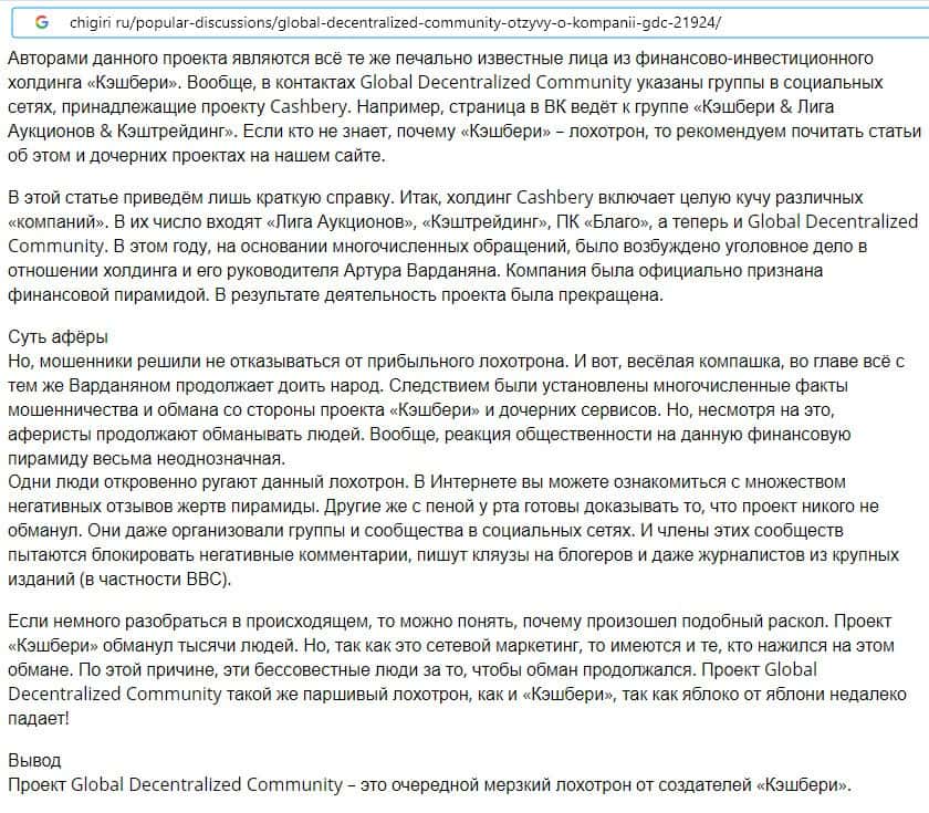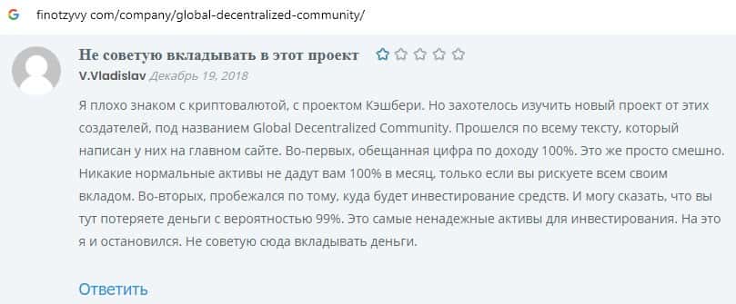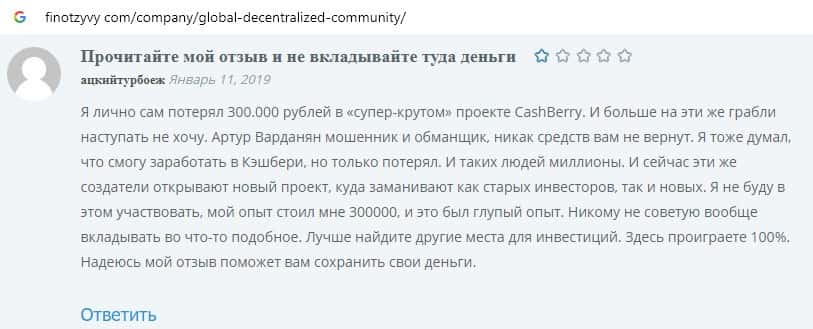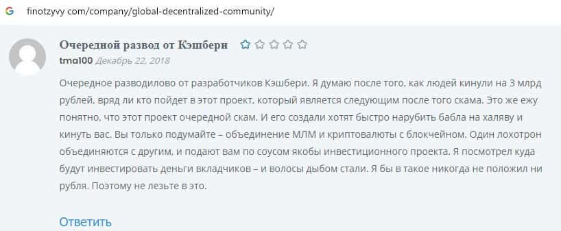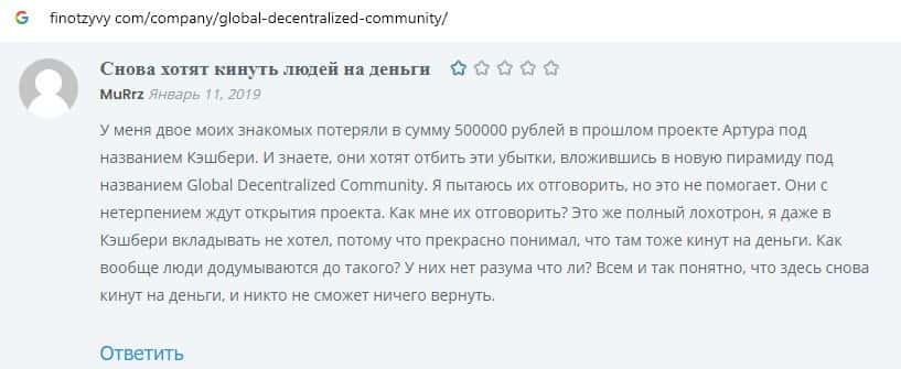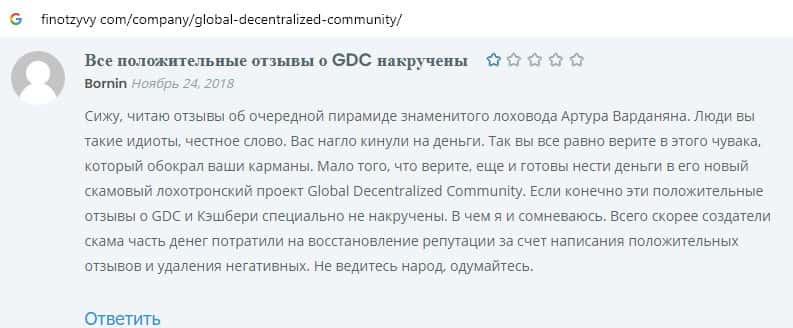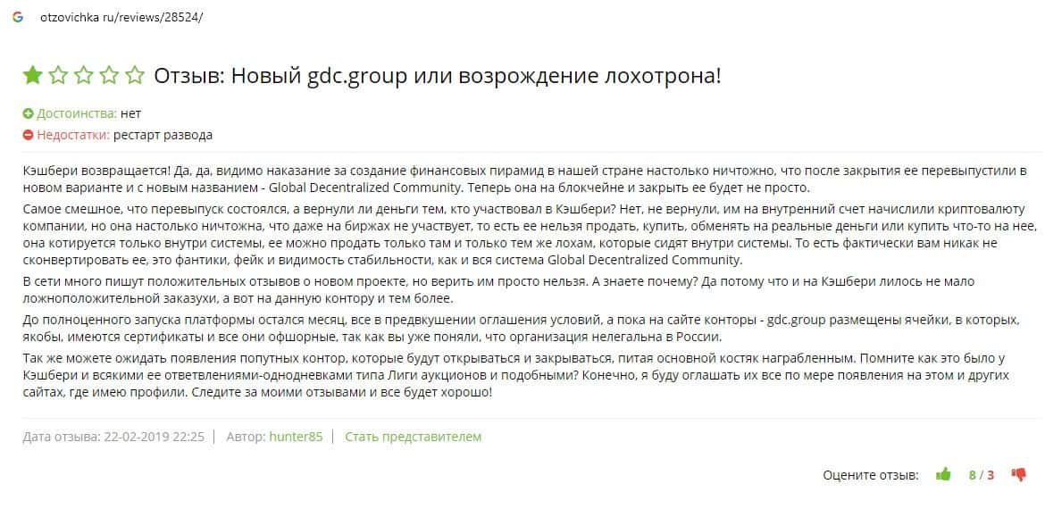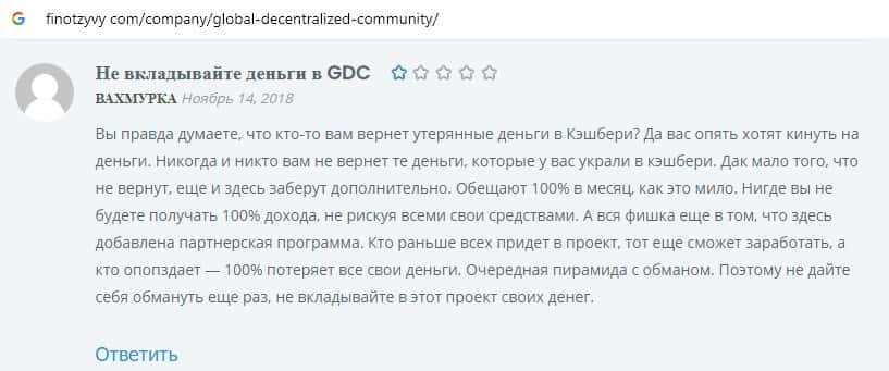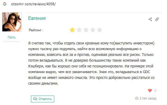 Пользователь пишет, что ранее хайп-проект GDC Invest назывался Кэшбери, контора соскамилась, аферисты обманули людей на крупную сумму денежных средств.