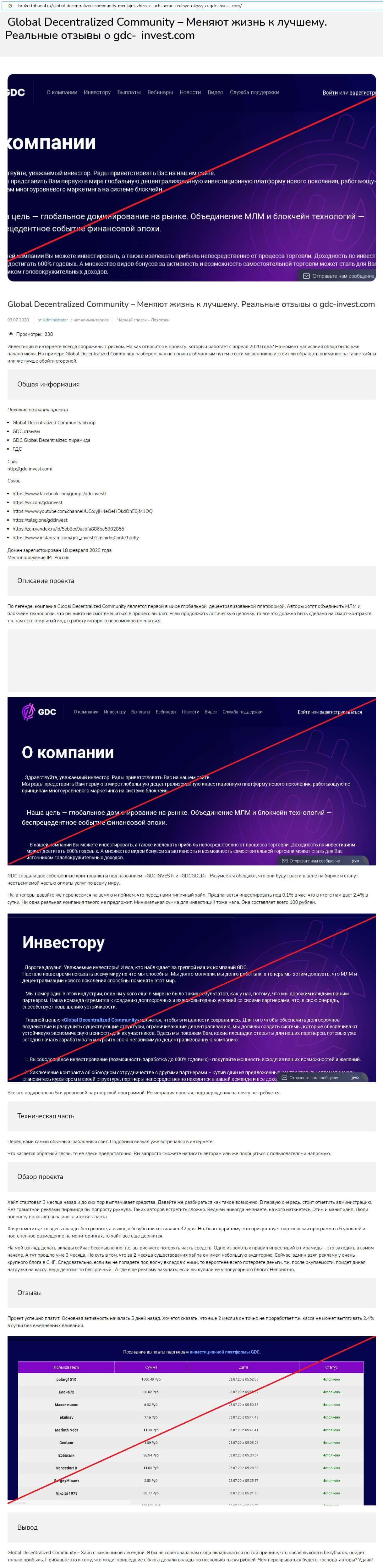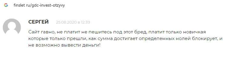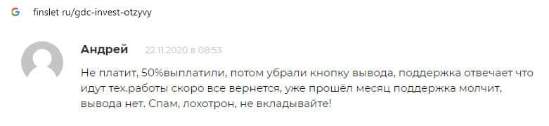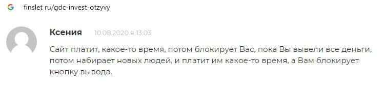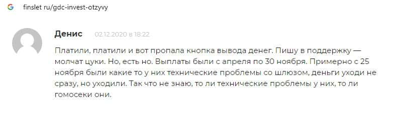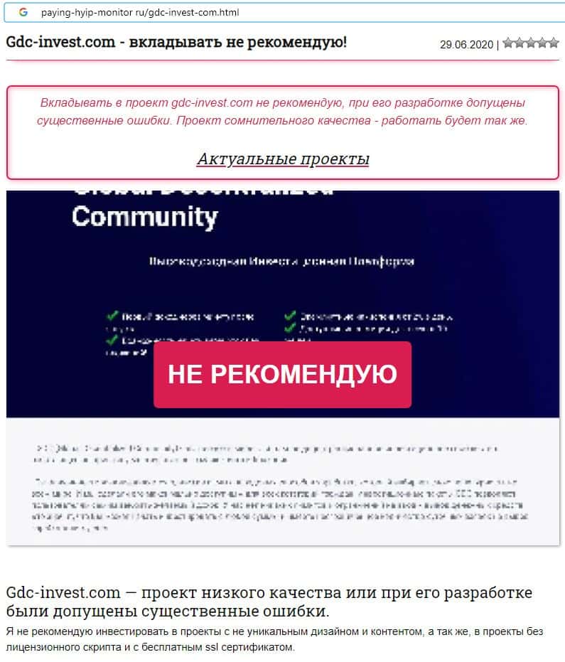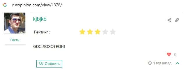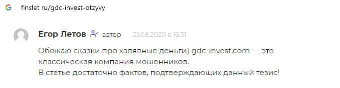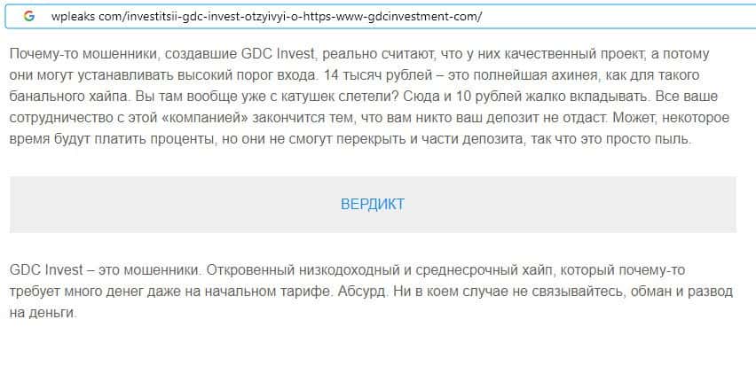 Далее предоставлен пользовательский отзыв об инвест-лохотроне GDC Invest, которому верить ни в коем случае нельзя.