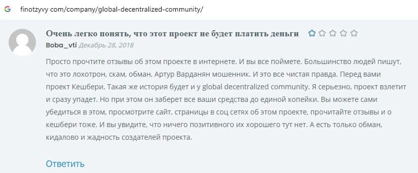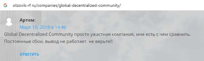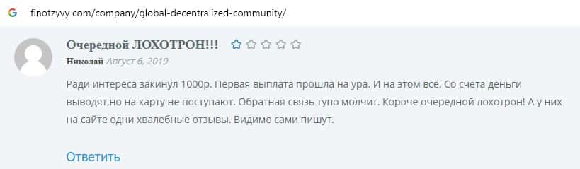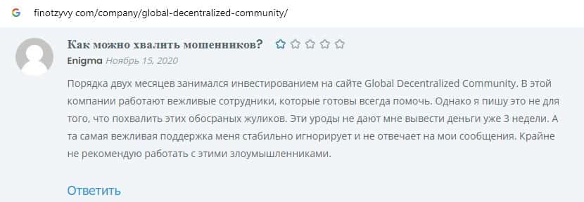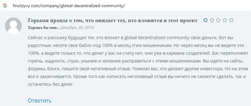 Связываться с мошенническим проектом Global Decentralized Community не рекомендуем, поскольку возможность вывести свои денежные средства не доказана.