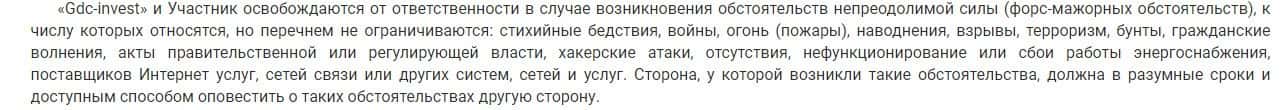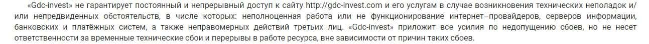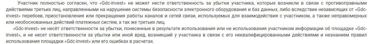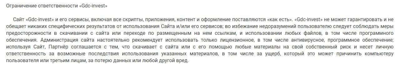 Согласно тому, что аферисты пишут в соглашении, скам-проект GDC Invest не несет никакой ответственности за не полученную прибыль клиентом, а также за возможные убытки.