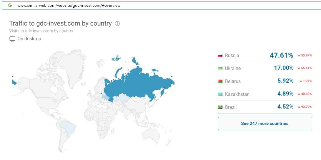 При проверке посещаемости интернет-ресурса мошеннической организации GDC Invest на similarweb com оказалось, что среди трафика есть пользователи из России и Украины.