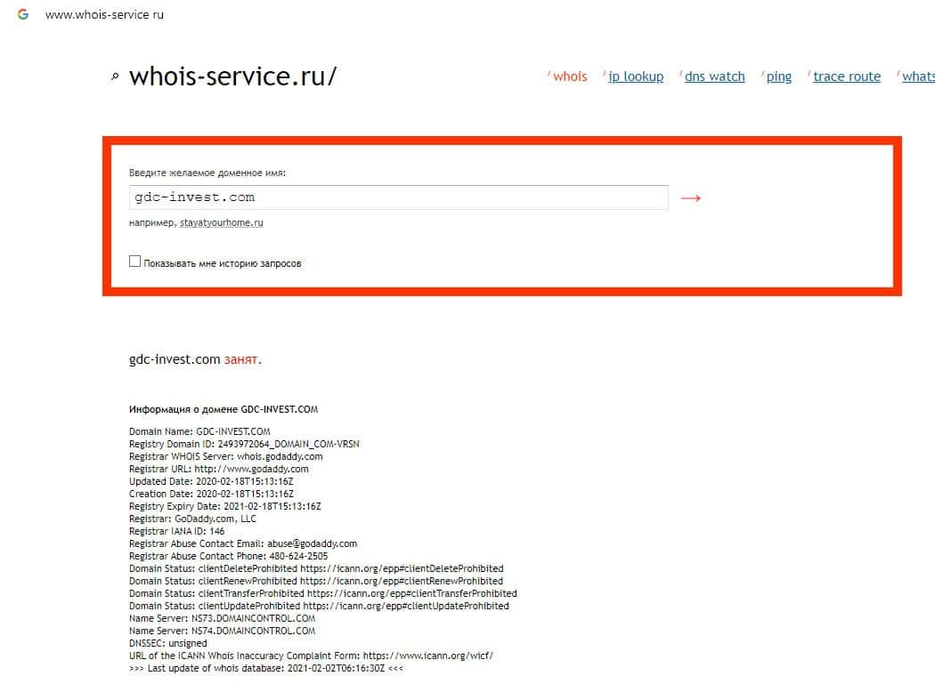 - Данные о владельце домена лохотрона GDC Invest отсутствуют