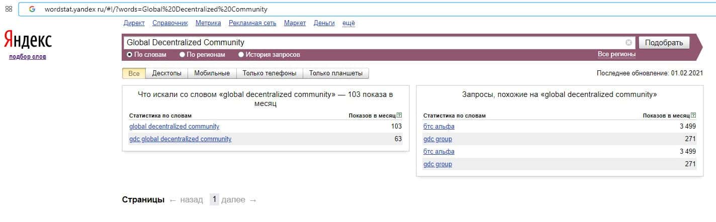 Количество брендовых запросов полного англоязычного названия компании "Global Decentralized Community" на wordstat yandex ru составляет 103 запроса за месяц.