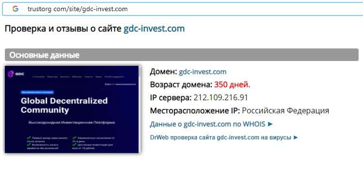 Проверка онлайн-сервиса жуликов GDC Invest на trustorg com показала, что возраст домена к моменту написания статьи составляет 350 дней, вероятнее всего домен купленный.