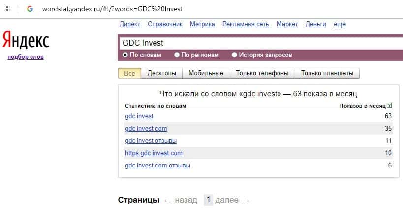 - Количество запросов по бренду GDC Invest в поисковике Yandex