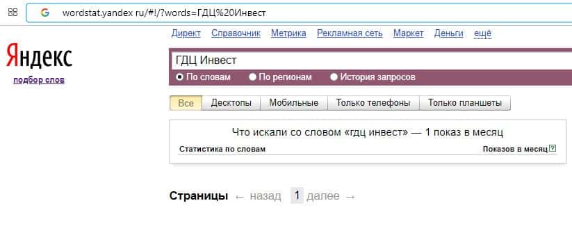 Количество запросов по бренду названия компании на русском языке "ГДЦ Инвест" на Вордстарт Яндекс Ру составляет всего 1 запрос за месяц.