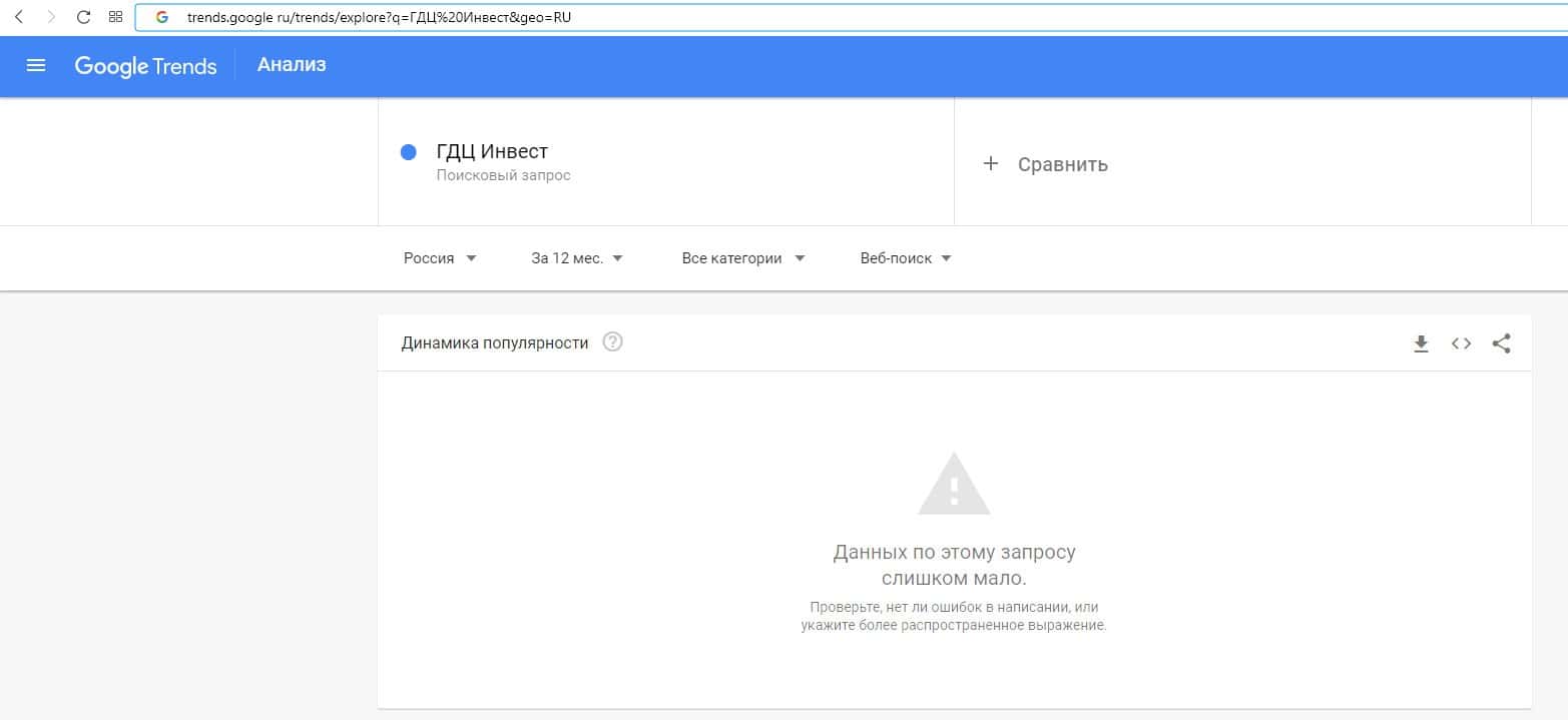 О количестве брендовых запросов название домена компании "gdc-invest.com" на Трендс Гугл Ру данные отсутствуют.