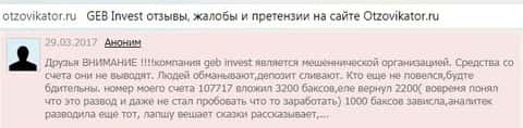 GEB Invest – очередная псевдо трейдинговая платформа, на деле являющаяся ничем иным, как Интернет-разводом, который лишает пользователей их вложений. Вложится в ГЕБ Инвест, как два пальца, на это и направлена их деятельность, нассать вам в уши и в глаза по поводу мнимой прибыльности они могут легко. Но вот о реальных заработках речи идти не может. Единственным направлением деятельности жуликов GEB Invest является развод доверчивых клиентов на деньги, и не только ни на йоту не приближает их к заработкам в Интернете, так еще и грозит потерей всех вложенных средств. Не доверяйте свои деньги мошеннической конторе ГЕБ Инвест.