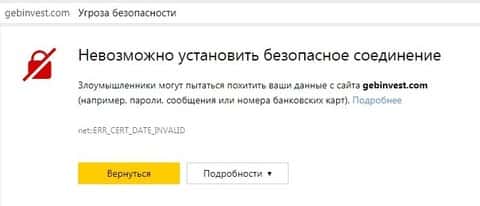 В попытке зайти на сайт мошенников ГЕБ Инвест, вас ждёт преграда. Угроза безопасности, что еще раз подтверждает статус этой мошеннической конторы. При входе на сайт некоторые ваши данные (пароли, сообщения или номера банковских карт) могут быть похищены.