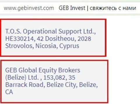На сайте ГЕБ Инвест указаны такие контакты: T.O.S. Operational Support Ltd., HE330214, 42 Dositheou, 2028 Strovolos, Nicosia, Cyprus (оффшор) и GEB Global Equity Brokers (Belize) Ltd. , 153,082, 35 Barrack Road, Belize City, Belize, CA (оффшор). Как и стоило ожидать эти контакты – фейковые. Они могут без проблем лишить вас всех накоплений, если вы закинете им на счёт средства. Найти же вы их адреса или контактные данные не сможете, ведь на сайте – липа, и никаких других данных о контактах либо руководстве конторы GEB Invest попросту нет.