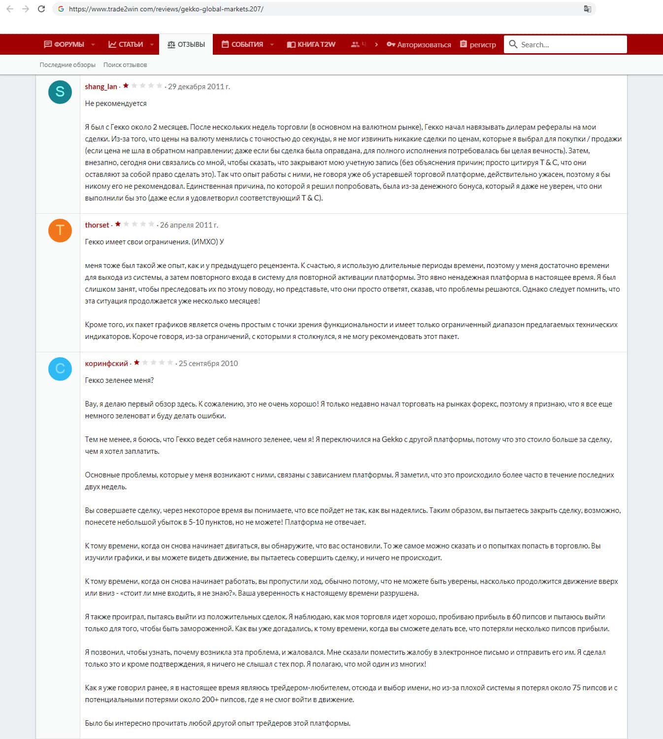 Удалось найти всего 3 отзыва о мошеннической организации Gekko Global Markets. К сожалению это всё, что осталось от слившихся жуликов. Но даже исходя из этой информации мы видим, какой была фирма мошенников. Нет ни одного положительного отзыва, сплошные недовольства конторой.
