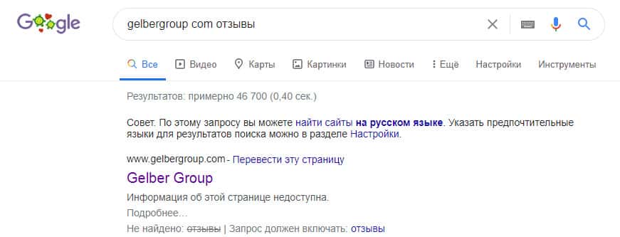 Ввиду крайне низкого возраста и крайне сомнительной деятельности шулеров Гелбер в сети интернет толком нету никакой информации о данной конторе, так как аферисты Gelber даже не позаботились об элементарной рекламе своей конторы. На изображении, расположенном ниже, вы можете наглядно увидеть результаты поиска проходимцев Гелбер.
