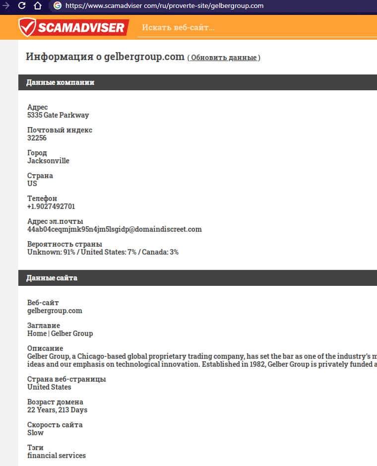 В связи с мошеннической и противозаконной деятельностью лохотрона Гелбер его реальные руководители предпочитают анонимность дабы избежать ответственности со стороны правоохранительных органов. Техническую же информацию о сайте жулья Gelber можно узнать с помощью портала scamadviser com, что вы можете непосредственно увидеть ниже.