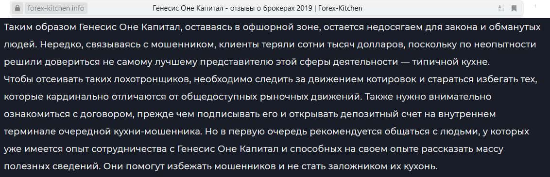 Своё активное продвижение шарашка Генесис Оне Капитал начала недавно, а поэтому еще немногие успели осознать, чем она пахнет. Одним из веб-ресурсов, взявшихся за просвещение людей на счёт данной шарашки, стал сайт форекскитчен инфо. Его редактор предупредил – анонимная оффшор-компания Genesis One Capital не заслуживает доверия и вложения денег.