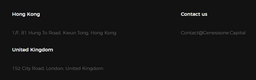 Единственной реальной информацией на сайте Генесис Оне Капитал являются контактные данные. Ну, как реальной информацией. В случае с адресом в Объединённом Королевстве, то тут у жуликов хватило ума написать только название улицы. Адрес же в Гонг-Конге, насколько нам удалось разузнать, не содержит никакой компании Genesis One Capital. Контакты: