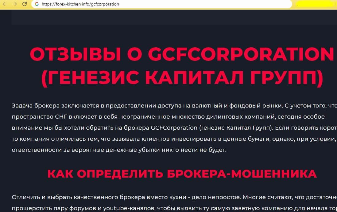 GCFCorporation - очередные интернет мошенники, которые кидая много информации на свой сайт, что бы запутать очередного зелёного трейдера который плохо ориентируется на финансовых рынках. Не доверяйте аферистам и лохотронщикам Генезис Капитал Групп иначе рискуете остаться не только без денег но и с минусами в кошельке!!!