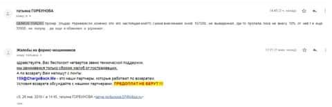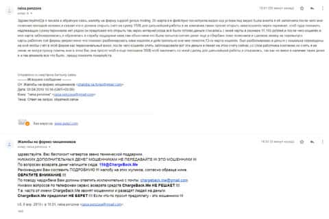 Поводом для написания данной статьи стали многочисленные жалобы на нашу почту о случаях кидания на деньги аферистами Генезис Трейдинг. Одна из таких жалоб представлена на изображении ниже. С жертвой жулики Genesis Trading поступили стандартно, а конкретно предложили влить деньги в их помойку, после чего тупо не давали их вывести, требуя выдуманные комиссии в виде вливания дополнительных средств..