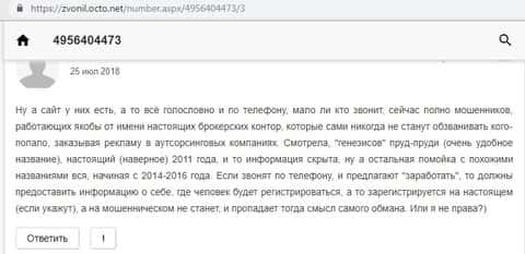 Стоит отметить, что жулики Genesis Trading довольно неплохо заботятся о базе положительных отзывов, однако исполнителей они выбирают так себе. Даже на форуме zvonil.octo net при разборе номера, с которого названивают мошенники Генезис Трейдинг было очень много купленных и ярко заметных положительных отзывов, отмеченных адекватной администрацией красными метками. Отзывы вечно одного плана и типа. После прочтения 5 - 7 подставных отзывов, они начали повторятся.