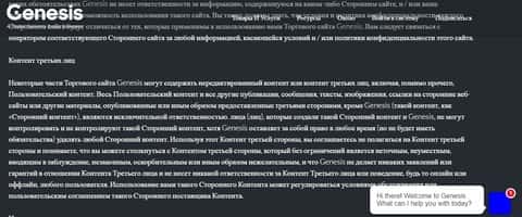 Не несут ответственности лохотронщики Genesis Trading и за контент третьих лиц, размещенный в их сайте помойки. Вы зададитесь логичным вопросом, что тут такого? Но дело в том, что подобным контентом посторонних лиц может быть все угодно, а именно от рекламы до котировок. Тоже самое обучение или ссылки на аналитику могут быть не связанными с шулерами Генезис Трейдинг, что сводит любую помощь и подсказки от них на нет, и создан подобный контент для выгоды исключительно мошенников Genesis Trading.