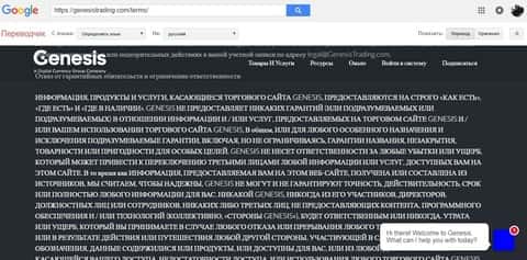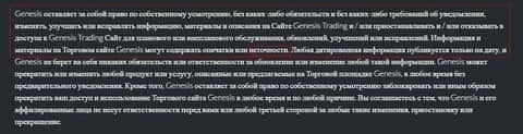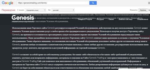 Условия использования аферистов Genesis Trading представлены на английском языке, поэтому для наглядности и понятности мы перевели их для вас с помощью переводчика Google. Итак уже с первых разделов жулики Генезис Трейдинг ставят вас перед фактом того, что они могут изменить данные условия в любой момент и без предварительного соглашения, а так же вы соглашаетесь с условиями фактом проведения торговых операций и активностью на сайте.