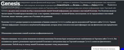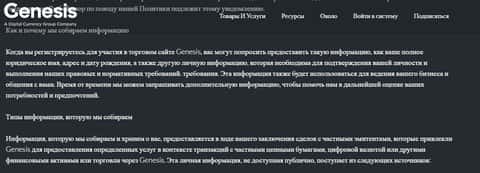 Политика конфиденциальности шулеров Генезис Трейдинг размещена в том же разделе сайта, что и их условия использования, однако находится ниже. Согласно первых же разделов данной политики жулики Genesis Trading имеют право делать с вашей личной информацией все, что описано в данной политике, но сразу же после этого абзаца идет пункт о том, что данную политику мошенники Генезис Трейдинг могут изменить в любой момент и вы соглашаетесь с этим по фактом того, что вам на почту приходит оповещение об этом.