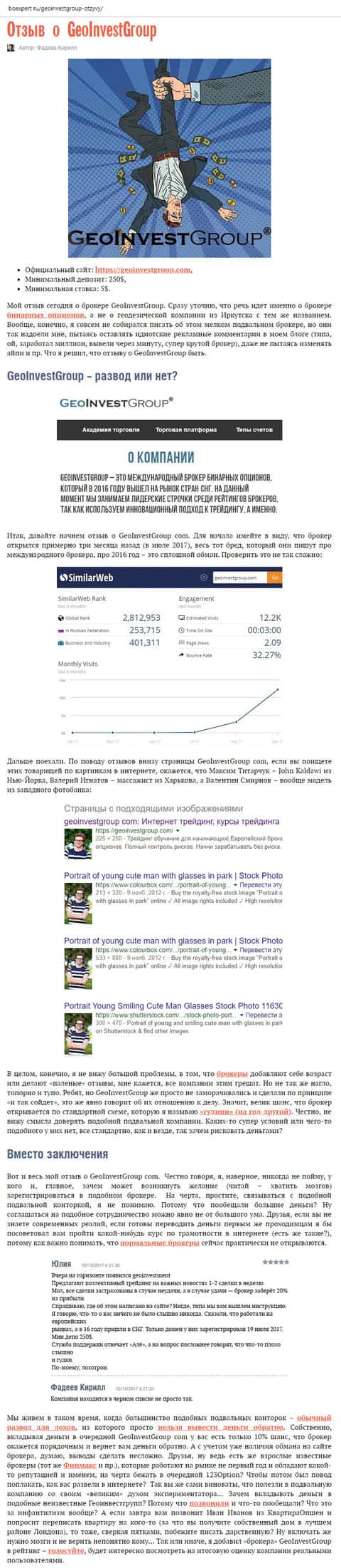 Чтобы найти остаточную информацию о брокерской конторе Geo Invest Group мы последовали на один интернет-ресурс, который как раз делал обзор при жизни данного лохотрона. Как нам стало известно - мошенники предоставляли брокерские услуги торговли на форекс и кидали людей налево и направо.