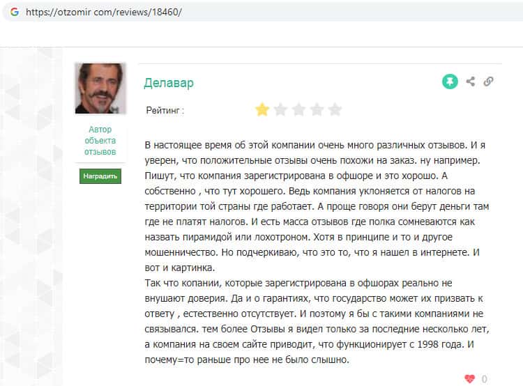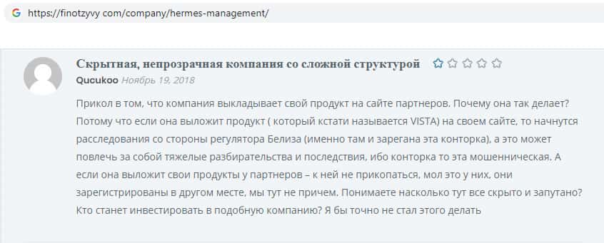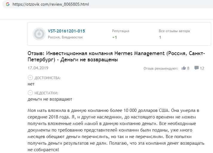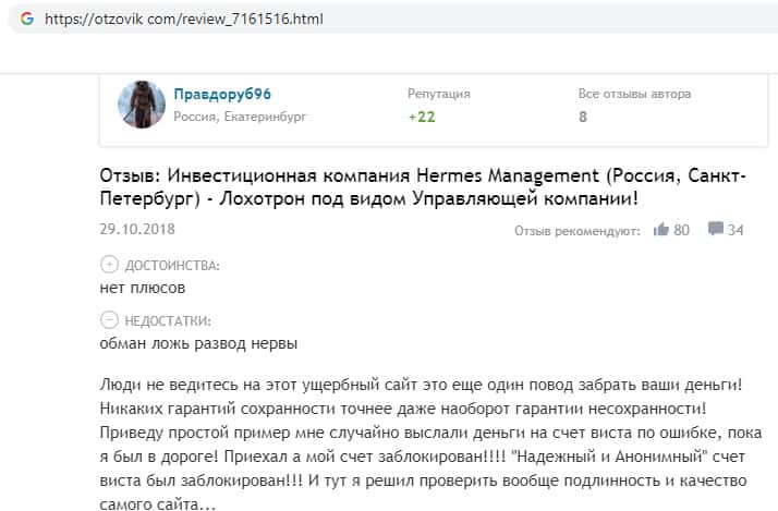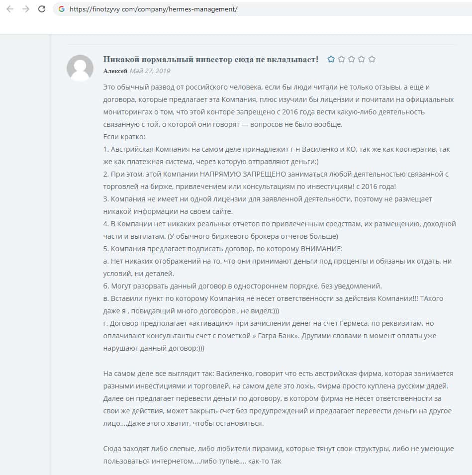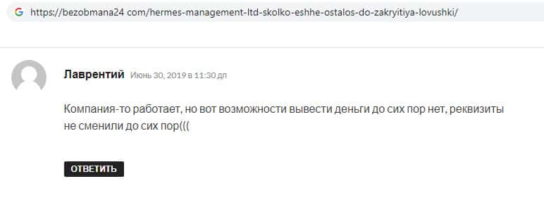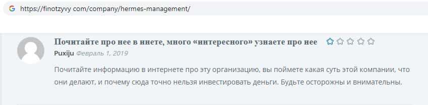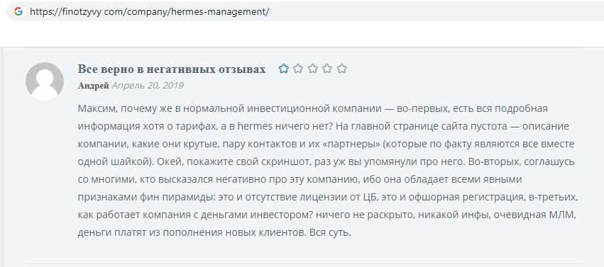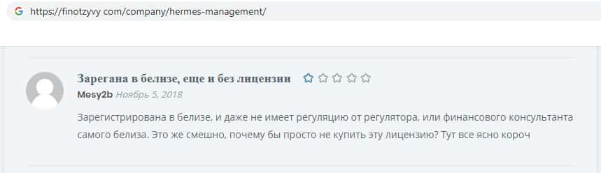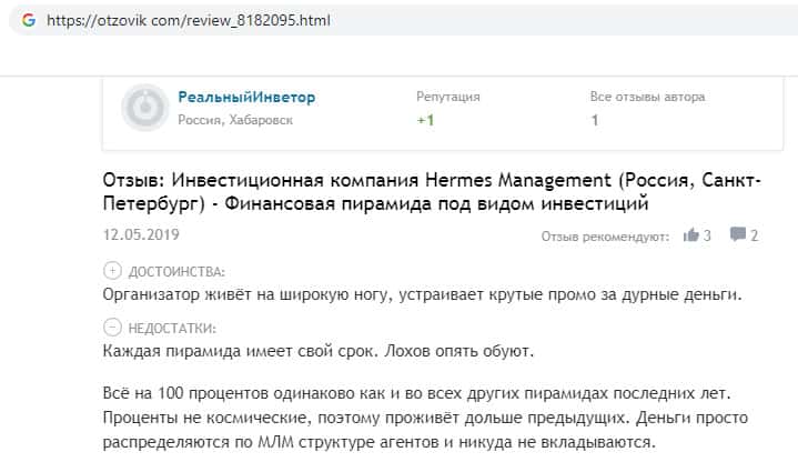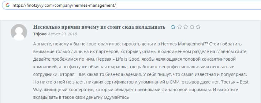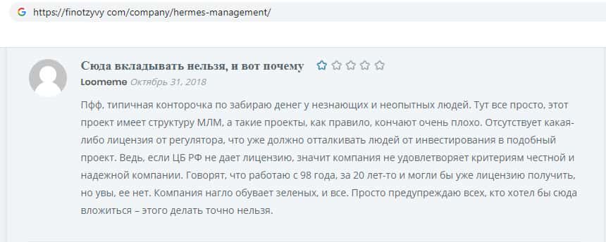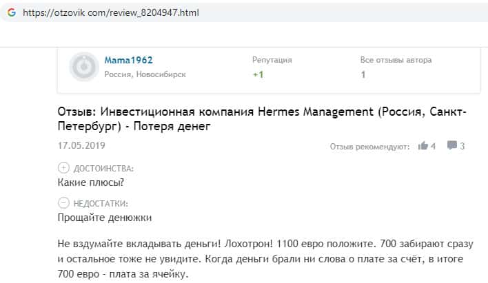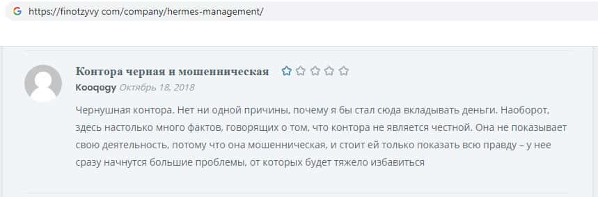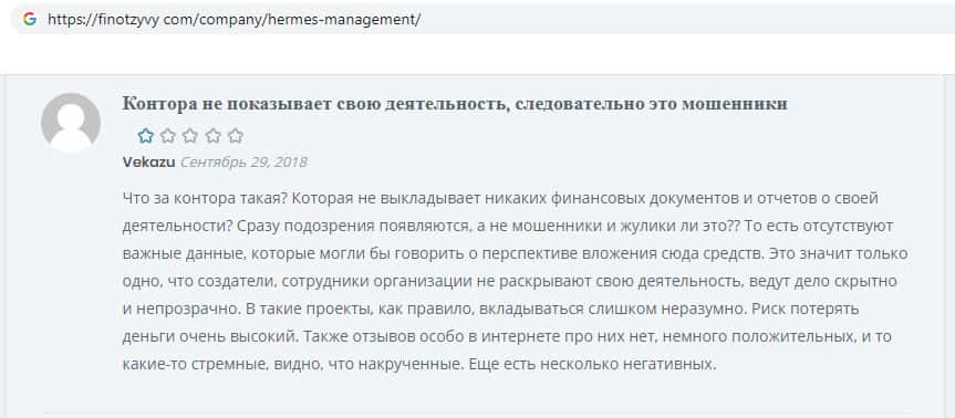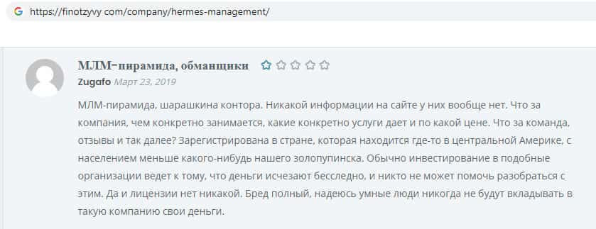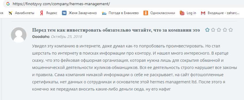 В данном отзыве мы видим как пользователь увидев эту контору решил попробовать инвестировать туда, но копнув глубже заметил, что это просто фейковая офшорная организация, которая своей деятельностью нарушает кучу законов. И это стало поводом не инвестировать в мошенническую организацию Hermes-Ltd Com.