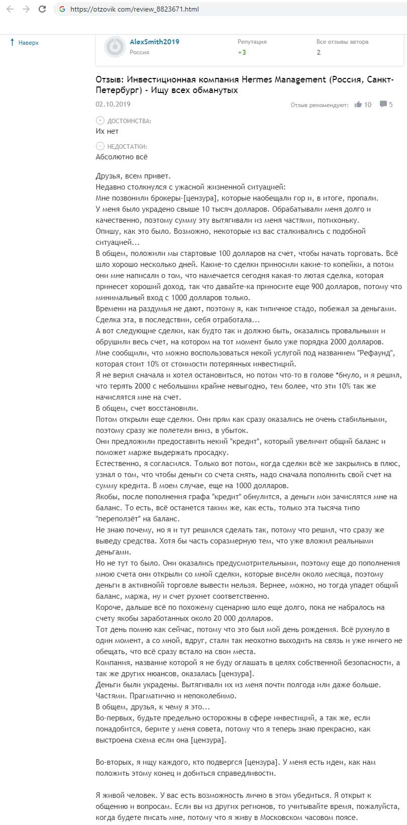 В отзыве мы видим историю человека, который связался с аферистами Гермес Менеджмент, и оказался в крайне печальной ситуации. Компания развела его на неплохие деньги. С начала попросили депозит, затем наобещали золотых гор, и требовали внести всё больше и больше, пока клиент не одумался и не понял, как его развели.