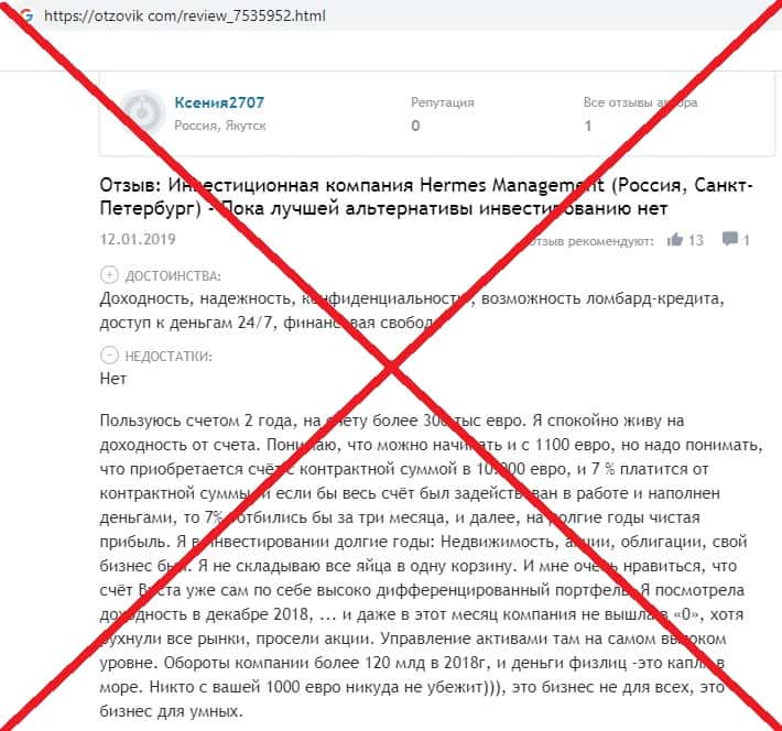 Пользователь внимательно изучил отзывы о кидалах Гермес Менеджмент, и пришёл к выводу, что все положительные отзывы заказные. Так как в них компания свои недостатки старается выдать за достоинства. И всё что плохо в компании, они говорят мол нет, так даже лучше. Это обычные действия мошенников, которых уже раскрыли.