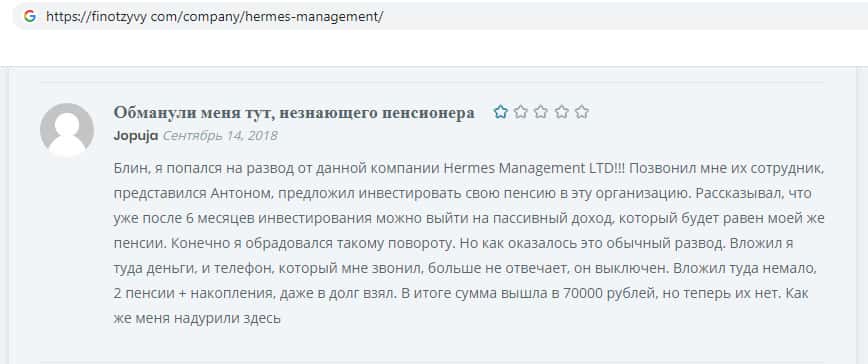 Данный отзыв написал обманутый пенсионер, который стал жертвой жуликов Hermes-Ltd Com. Он рассказал как узнал о данной фирме, как в телефонном режиме общался с представителем компании, и тот выманил у него кучу денег, а затем пропал, на телефон не отвечал и был недоступен, и деньги пенсионера пропали навсегда.
